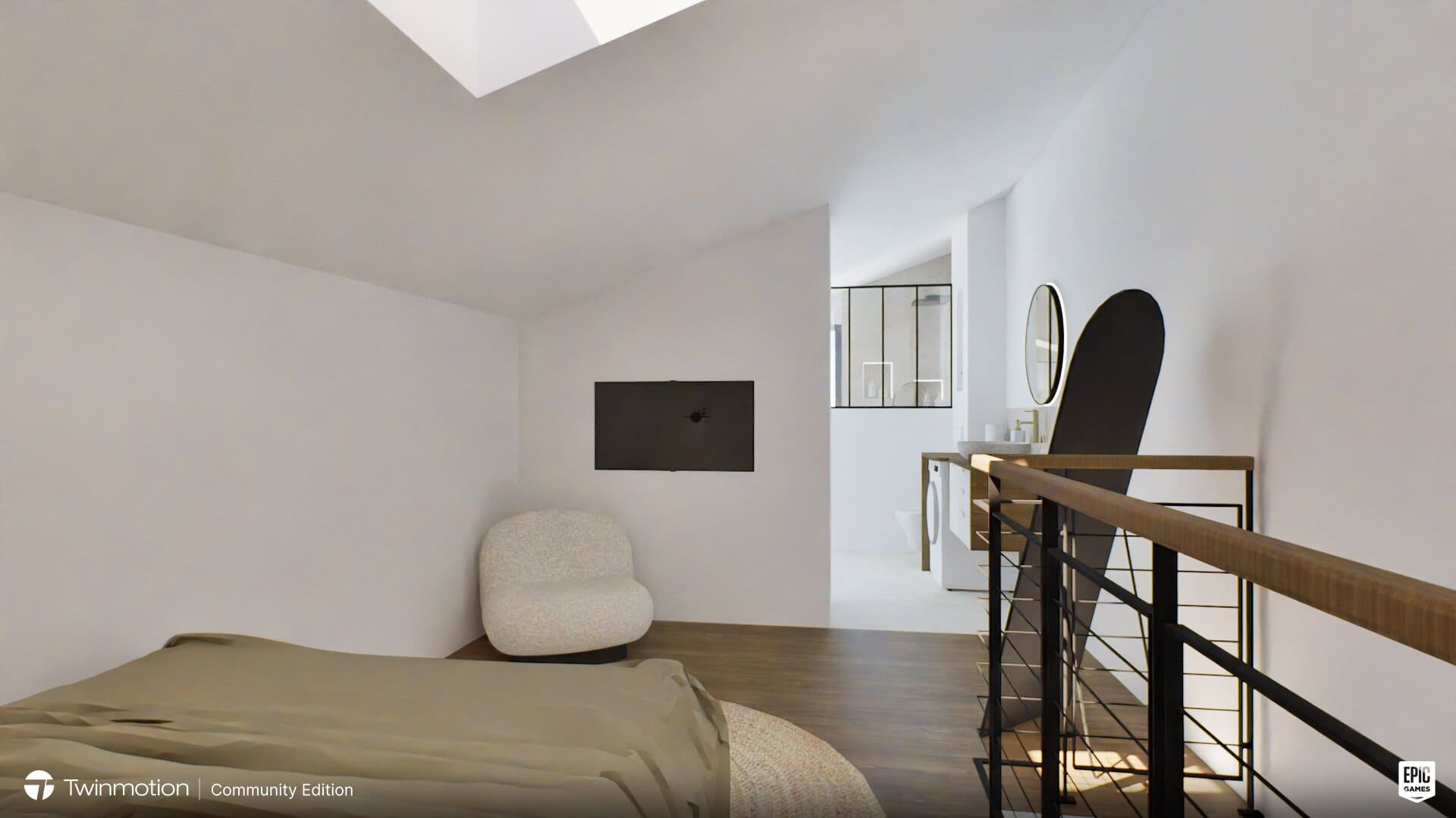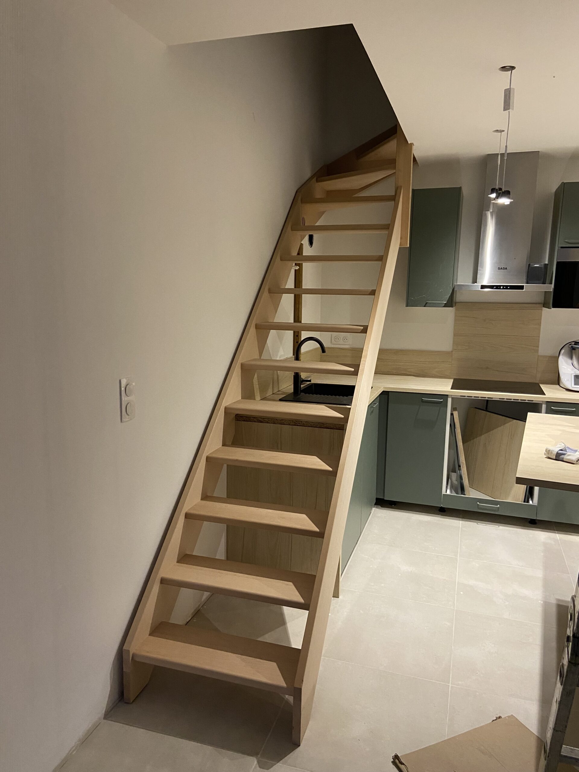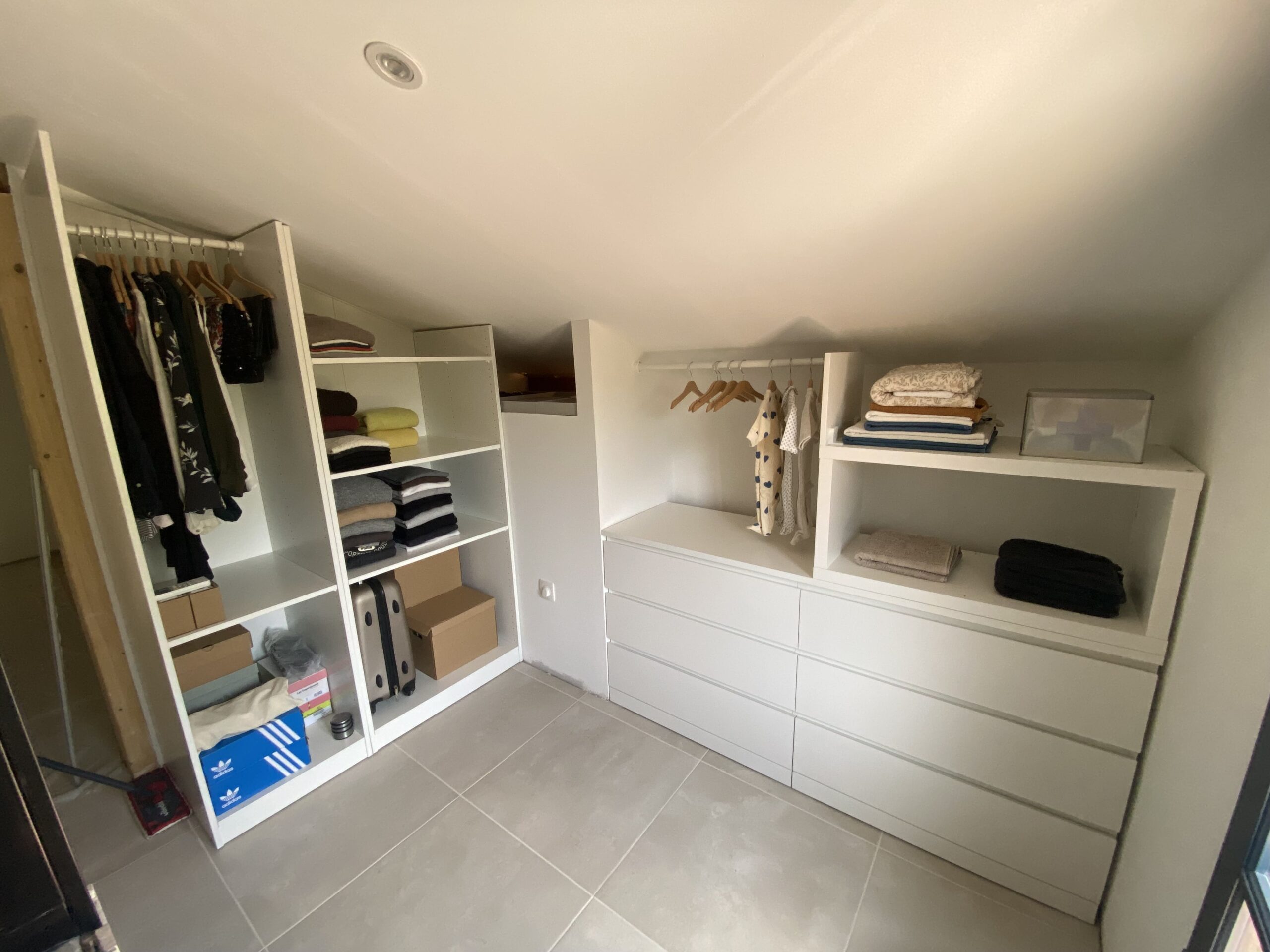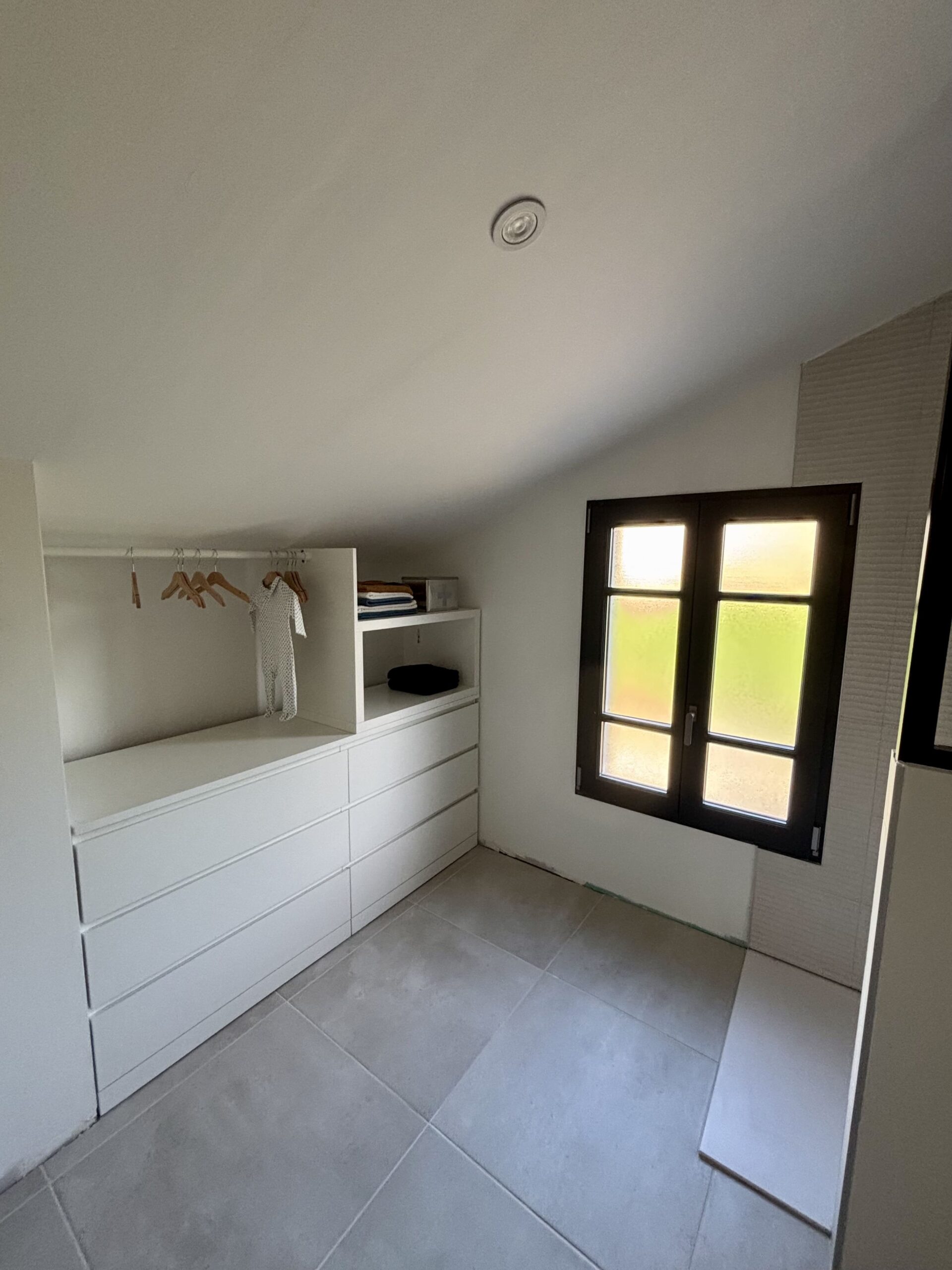L’accent a été mis sur la fonctionnalité avec de nombreux rangements intégrés, pensés pour libérer l’espace et simplifier le quotidien. À l’étage, le velux prolonge la luminosité naturelle, offrant une ambiance calme et intime.