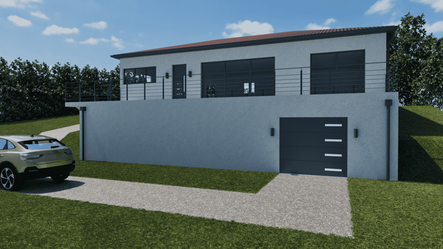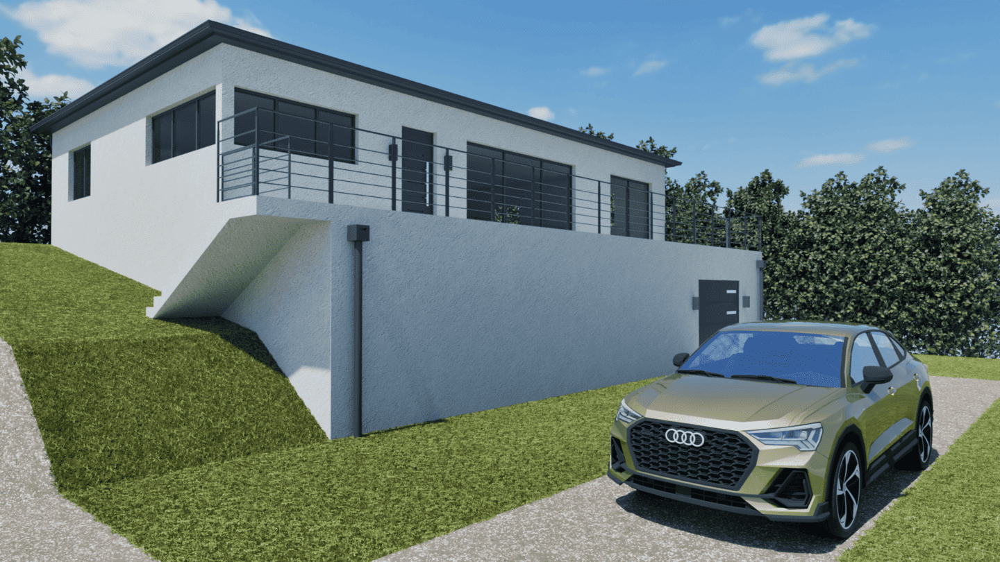 Cette maison de plain-pied a été conçue pour s’implanter naturellement sur un terrain en pente de 17 %. Au rez-de-chaussée, le volume principal de la maison développe 120 m² habitables, répartis de manière fonctionnelle. Elle repose sur un sous-sol de 145 m² entièrement dédié au stationnement.