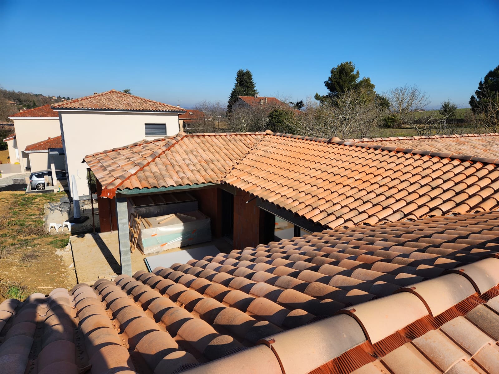 Les toitures en pente, réalisées en charpente bois et recouvertes de tuiles canal teinte vieux midi, varient subtilement selon les volumes, renforçant le caractère architectural de la maison tout en respectant l’équilibre général.